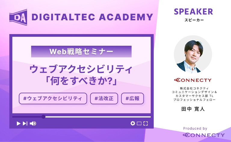 「ウェブアクセシビリティ」を気にされている広報、Web担当者の方必見のセミナー。 「ウェブアクセシビリティとはなにか?」という基本的なことから、法改正による影響、決めるべき事、そして多くの大企業のサイトリニューアルを手掛けてきた豊富な実績に基づくウェブアクセシビリティの実現方法について解説します。 一緒に、全てのユーザーにとって使いやすいウェブ環境を作り上げましょう!こんな方におすすめです